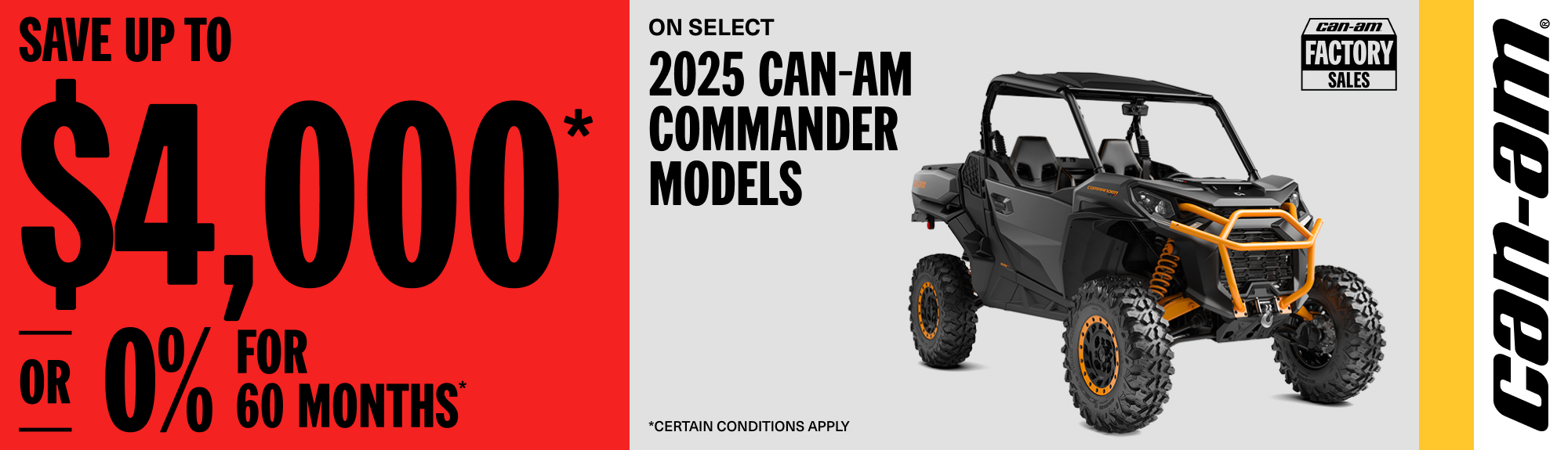 Rebate of up to $4,000 or 0% for 60 months on select 2025 Can-Am Commander models
