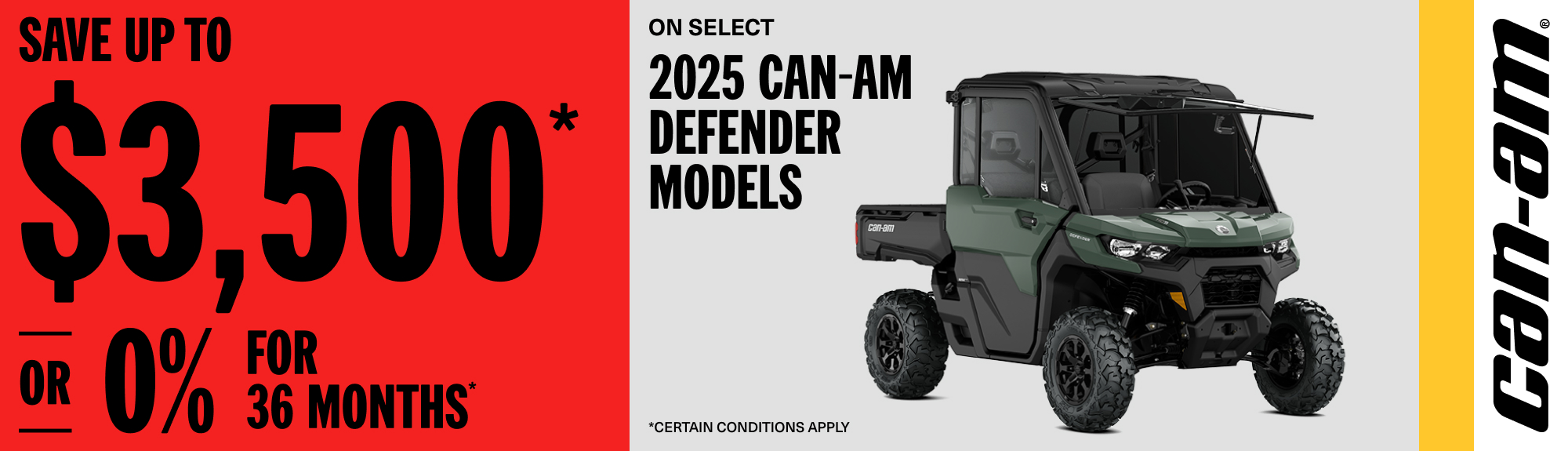 Rebate of up to $3,500 or 0% for 36 months on select 2025 Can-Am Defender models