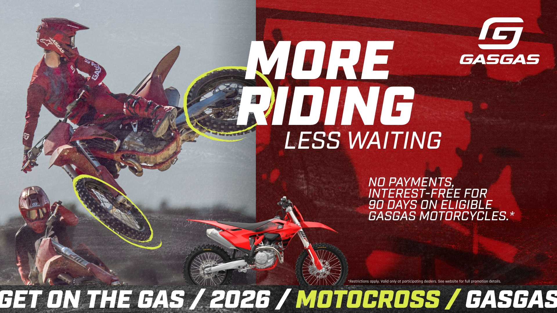 *Terms and Conditions: : Offer applies to new, untitled and unregistered 2024 GASGAS TXT RACING (250 / 300), TRAILS GP (250 / 300), MC-E (3 / 5), MC (50 / 65 / 85 (17/14 & 19/16) / 125 / 250 / 250F / 350F / 450F / 450F Factory Edition), EX (250 / 300 / 250F / 350F / 450F), EC (250), ES (350 / 500 / 700) and SM 700 model motorcycles. Financing offer available through Santander Consumer Bank “Santander”. Where no money down is indicated, it is available only to those well-qualified applicants with approved credit. Annual Percentage Rates (APR) of 0.99% for up to 60 months, and no down payment offers available to qualified applicants only. Santander requires a minimum financing amount of $1,500. Not all buyers will qualify and if approved may receive a higher rate and higher payment, depending on credit score. Some buyers will require a higher down payment in order to receive credit approval. Other charges may apply. Subject to model availability and dealer participation. Subject to credit approval by Santander, not all applicants will qualify. Santander maintains the right to charge back all costs of financing should a retail promotion and a financing offer be selected when the 2 cannot be combined (as defined in the retail program). Financing offer can change or be cancelled at any time. Offer valid January 1, 2026, through March 31, 2026. This offer cannot be combined with any other offers. Finance offer valid through authorized GASGAS dealers only. See local authorized dealer for details.