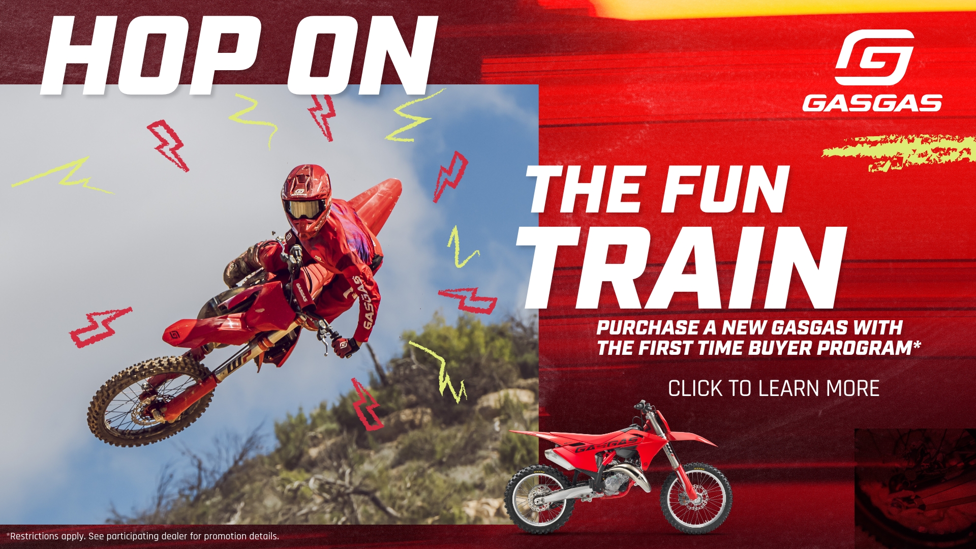 *Terms and Conditions: Offer applies to new, untitled and unregistered 2024 GASGAS TXT RACING (250 / 300), TRAILS GP (250 / 300), MC-E (3 / 5), MC (50 / 65 / 85 (17/14 & 19/16) / 125 / 250 / 250F / 350F / 450F / 450F Factory Edition), EX (250 / 300 / 250F / 350F / 450F), EC (250), ES (350 / 500 / 700) and SM 700 model motorcycles. Financing offer available through TD Auto Finance. Where no money down is indicated, it is available only to those well-qualified applicants with approved credit. Annual Percentage Rates (APR) of 0.99% for up to 60 months, and no down payment offers available to qualified applicants only. Not all buyers will qualify and if approved may receive a higher rate and higher payment, depending on credit score. Some buyers will require a higher down payment in order to receive credit approval. Other charges may apply. Subject to model availability and dealer participation. Subject to credit approval by TD Auto Finance, not all applicants will qualify. Financing offer can change or be cancelled at any time. Offer valid January 1, 2026, through March 31, 2026. This offer cannot be combined with any other offers. Finance offer valid through authorized GASGAS dealers only. See local authorized dealer for details.