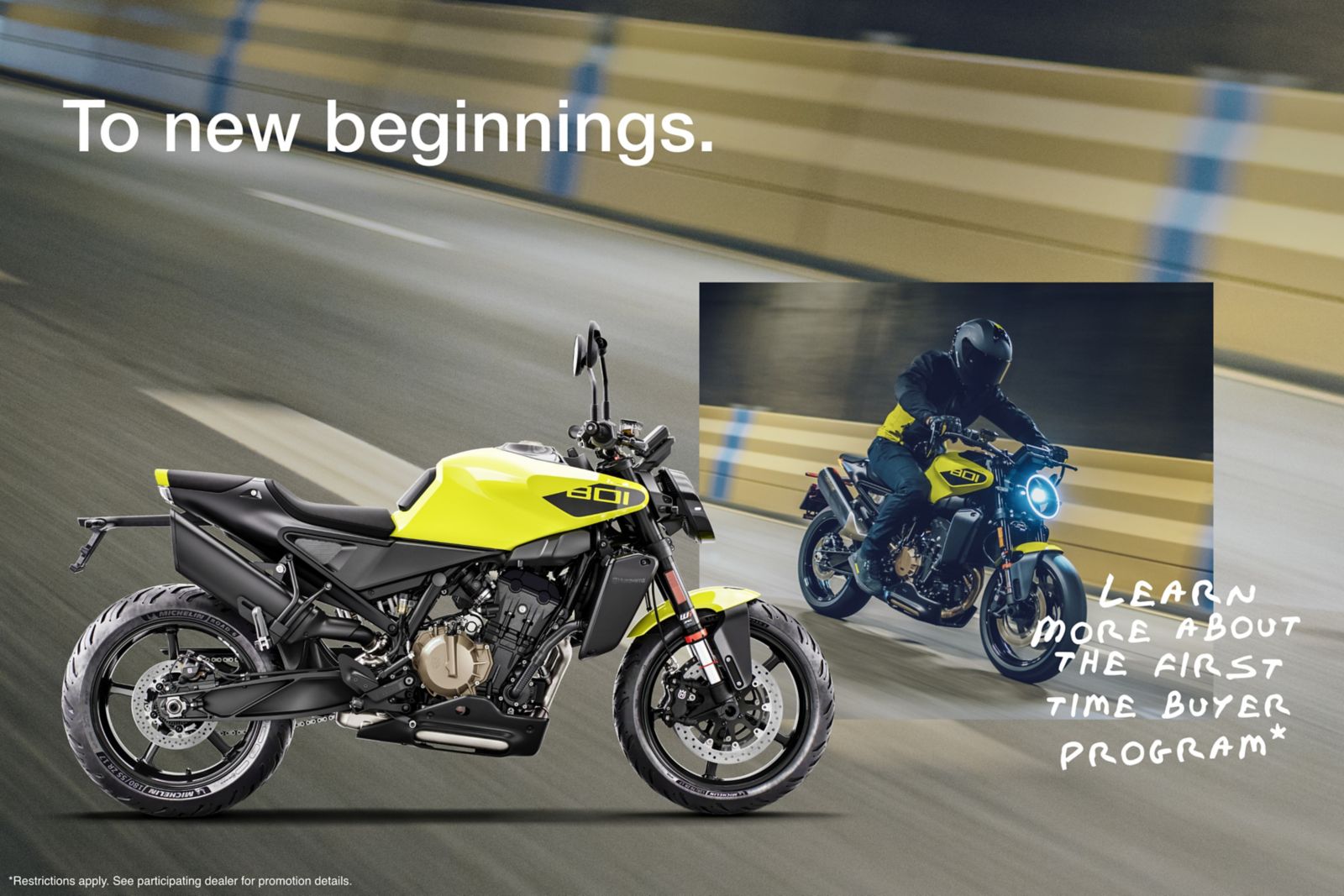 Redefine Freedom. Now, until December 31, 2026, qualified first-time buyers with limited credit can purchase a new, unregistered Husqvarna motorcycle through the FreedomRoad First Time Buyer Program, and begin their life-long journey on two wheels.